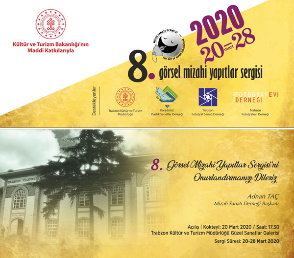 Bu nedenle 20 MART 2020 tarihinde saat 17.30 da Trabzon Kültür ve Turizm Müdürlüğü Güzel Sanatlar Galerisinde açılışını yapmayı planladığımız 8. GÖRSEL MİZAHİ YAPITLAR SERGİSİ 13 KASIM 2020 TARİHİNE ERTELENMİŞTİR. Sergi 13-21 KASIM 2020 tarihleri arasında açık kalacaktır. Sergimize eser gönderen sanatçılarımıza, sergi açılışı için davet gönderdiğimiz ve duyuru yaptığımız değerli sanat dostlarına ve sanatseverlere duyrulur.